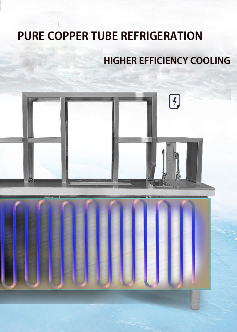 Bubble tea bar with refrigeration and boba cup bubble tea ,The function of the sink is flushing. This is determined by the store staff. Generally, 1 to 2 sinks will be provided. The two sinks are convenient for two baristas to operate at the same time, and the work efficiency is doubled. The sink can be placed at any position on the operating table, but if it is a refrigerated cabinet-type operating table, the sink is mostly designed at the compressor position. This design saves cabinet storage space.Bubble tea bar with refrigeration and boba cup bubble tea