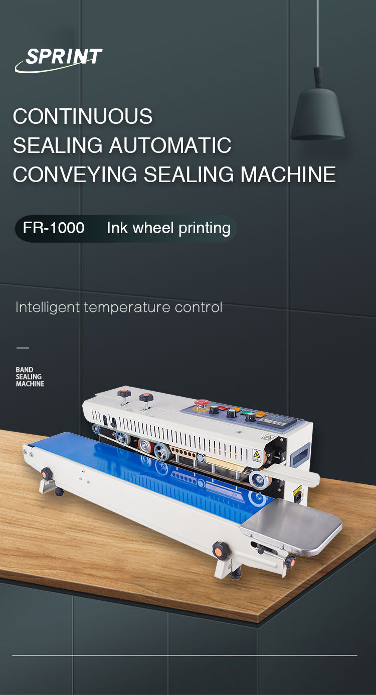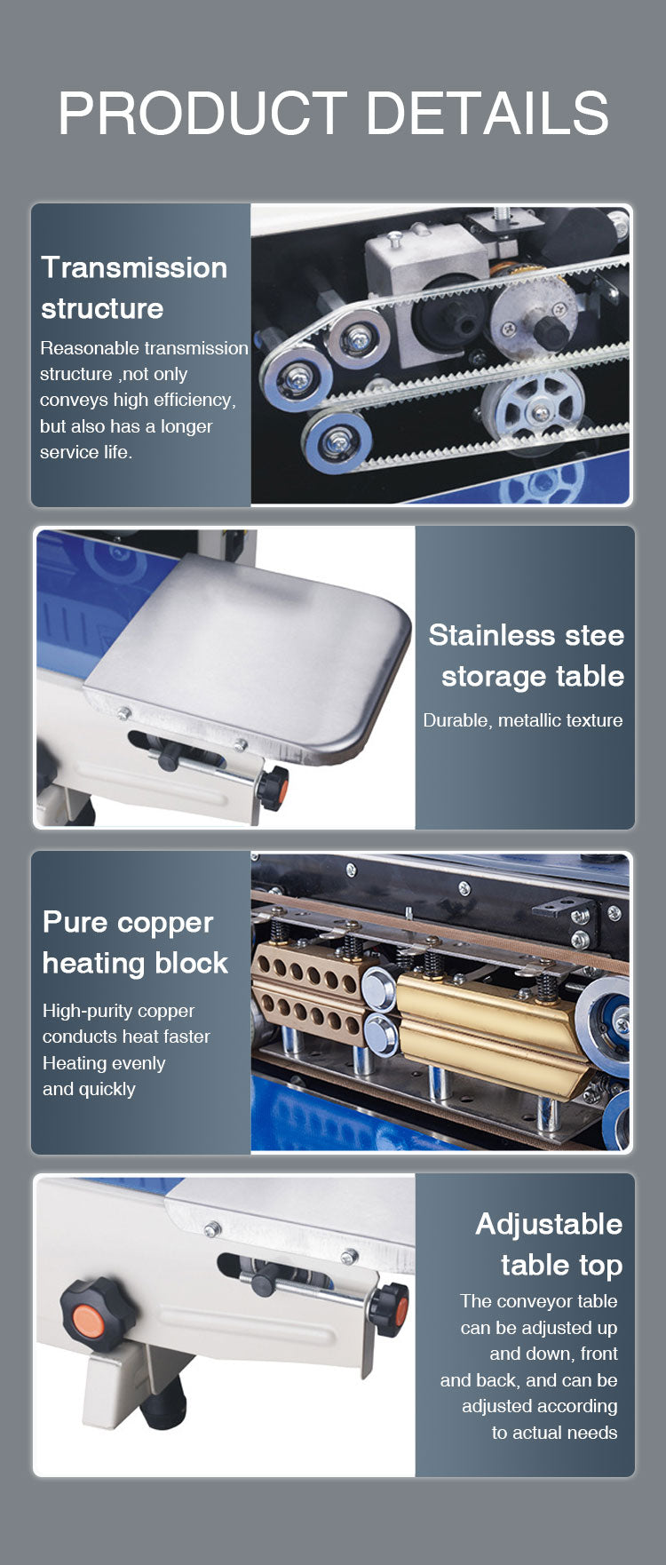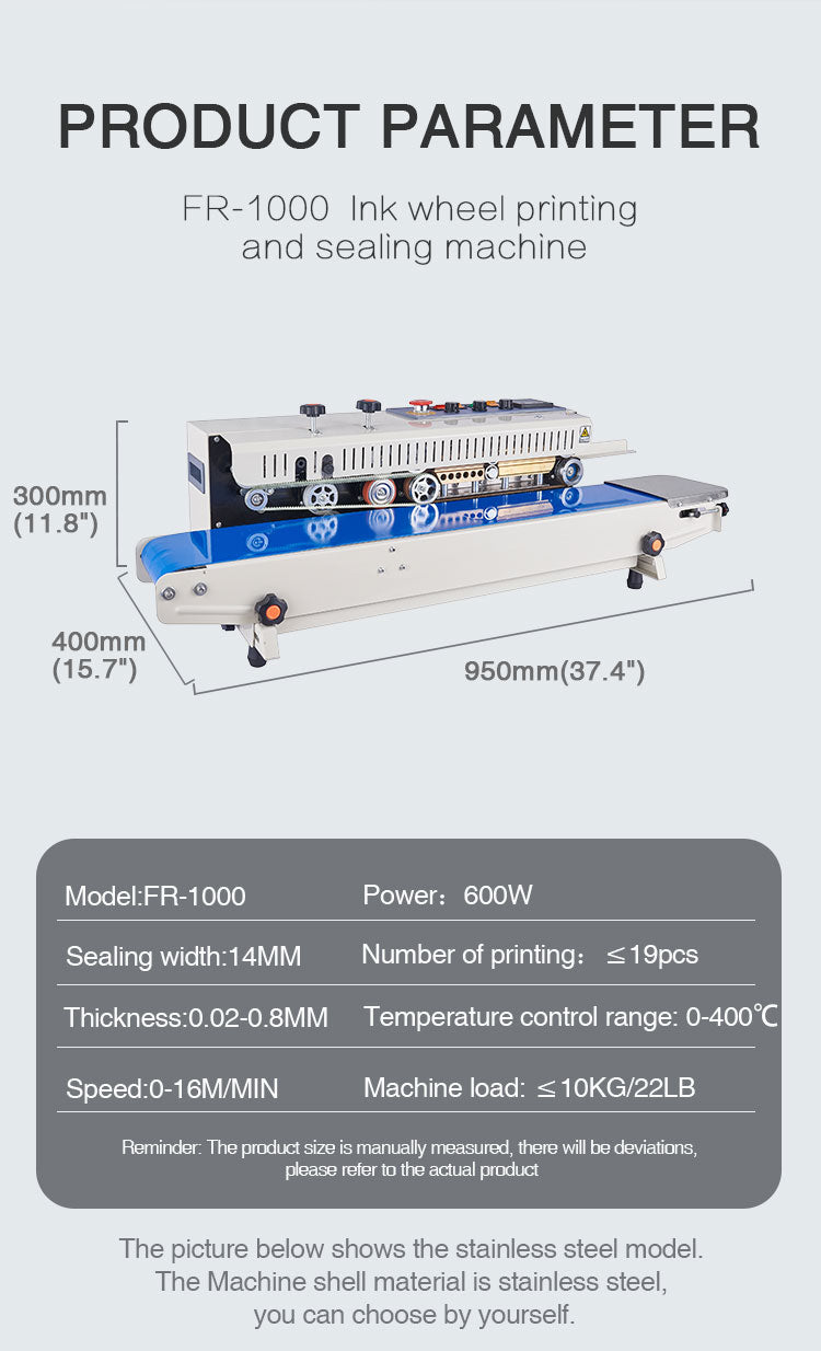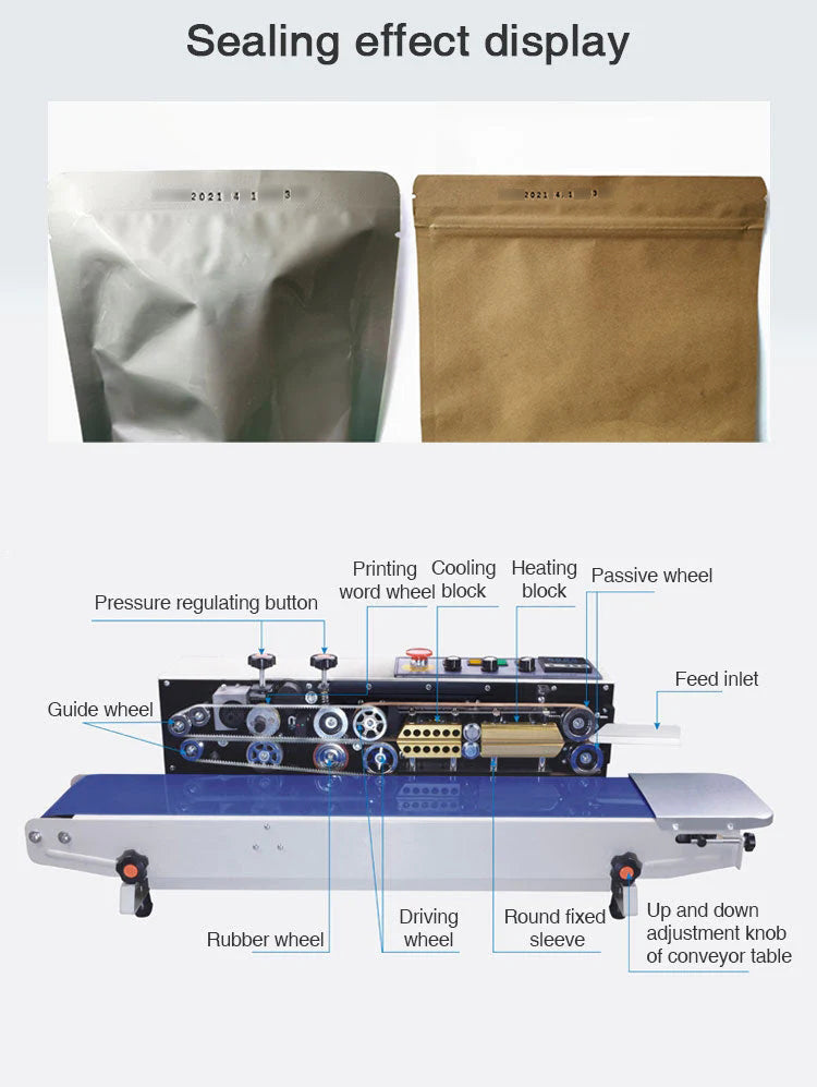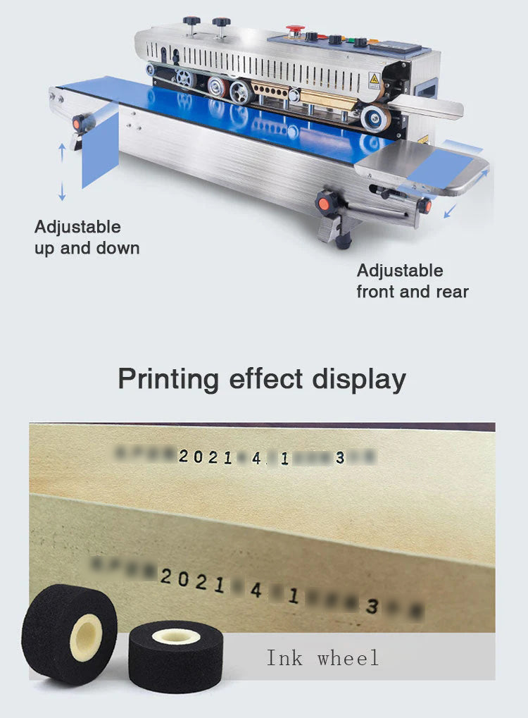 This continuous band sealer machine is suitable for sealing package bags made of various film such as plastic film, aluminum foil and complex film etc. It is widely used in pharmaceutical, Food, Dairy use and other packaging industries. The machine is Ink wheel printing.This sealing machine has two materials, one is spray paint and the other is stainless steel.