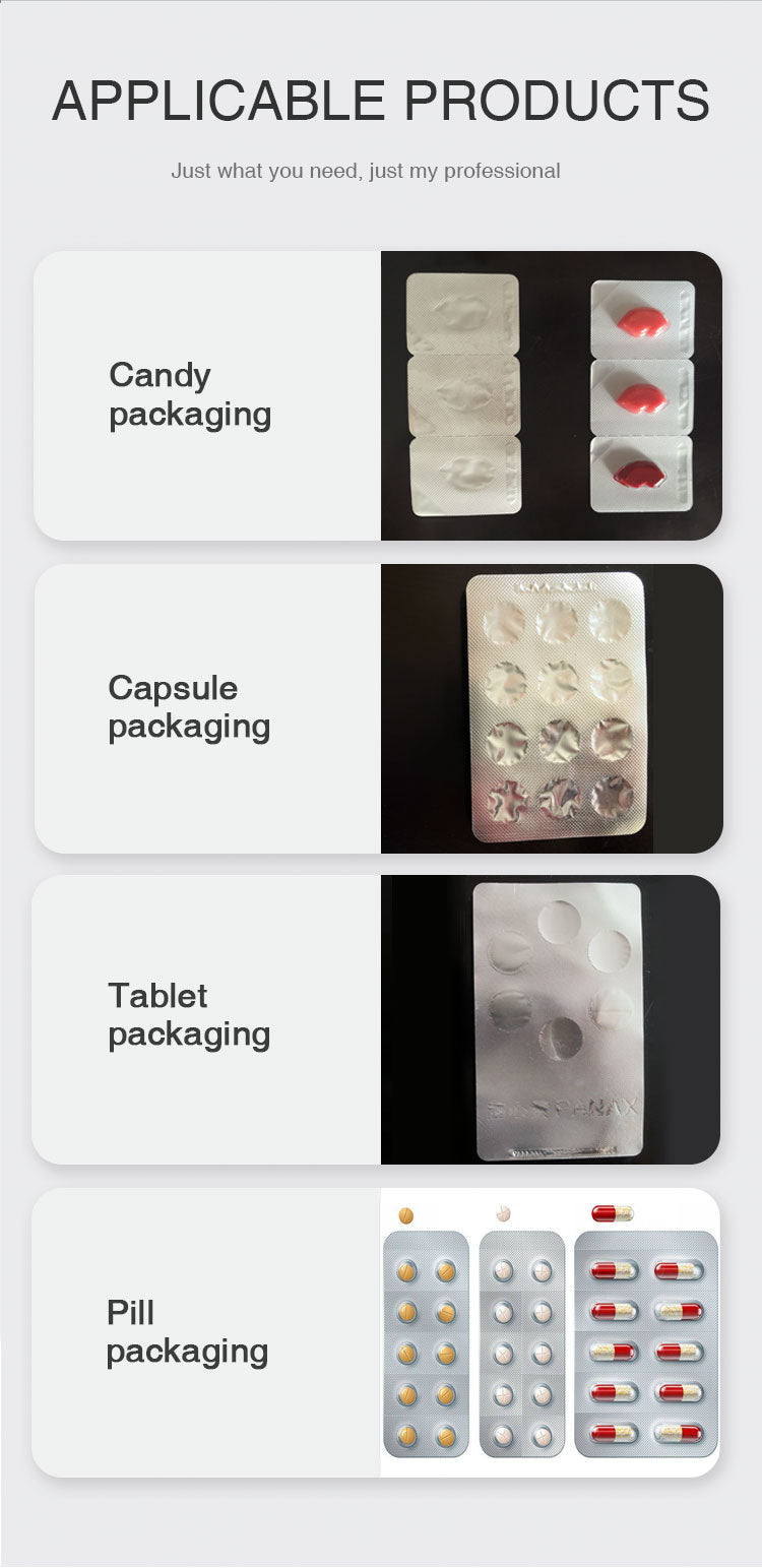 This machine is designed for small pharma factory, healthcare plant, food plants and preparation rooms,can be used to pack solid drugs like capsule, tablet, gelatin pearl, suppository, milk tablet, candy and hardware. The whole set is of compact design, beautiful appearance, smooth operation and low noise. Use internal heating method to ensure the PVC is evenly heated. There is no bubble in the aluminum foil while heating and hence no waste will occur.