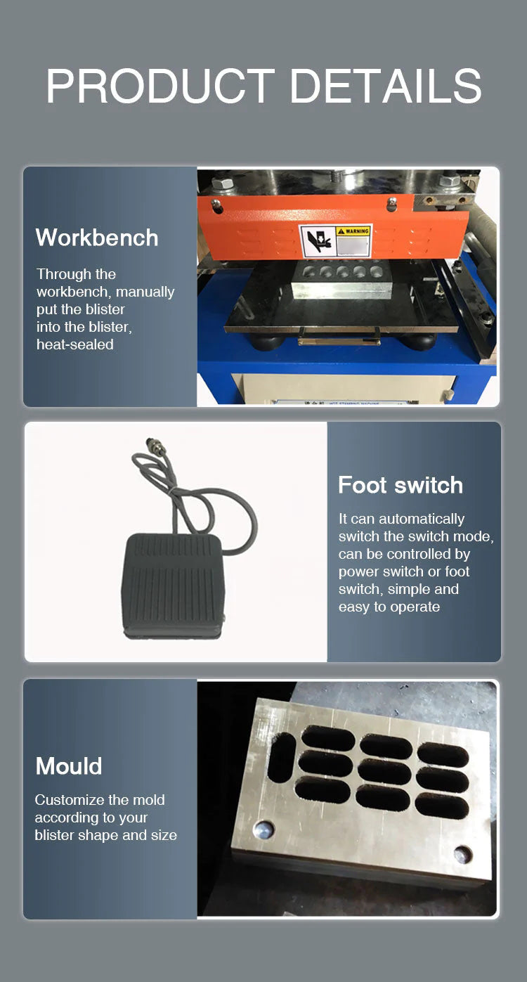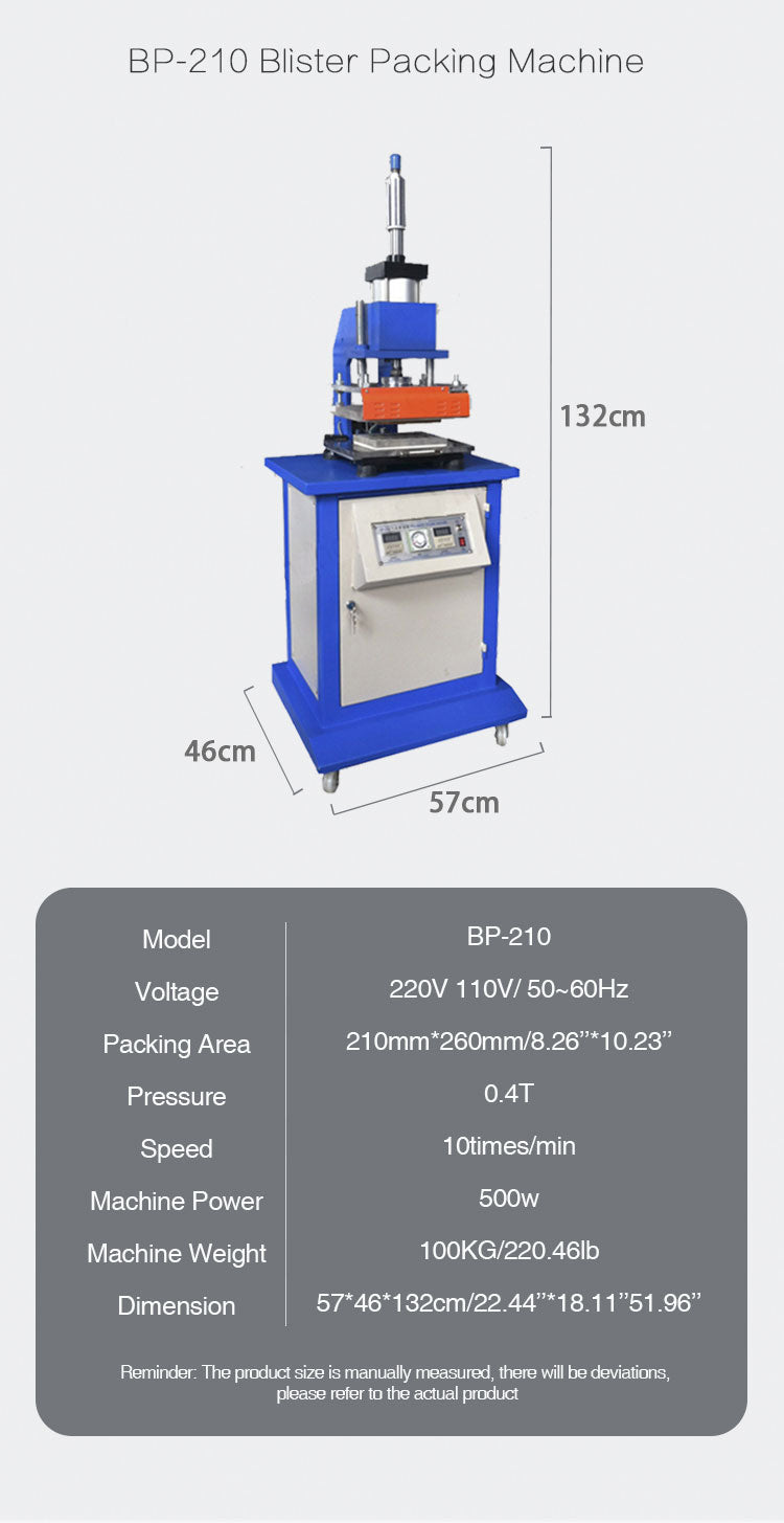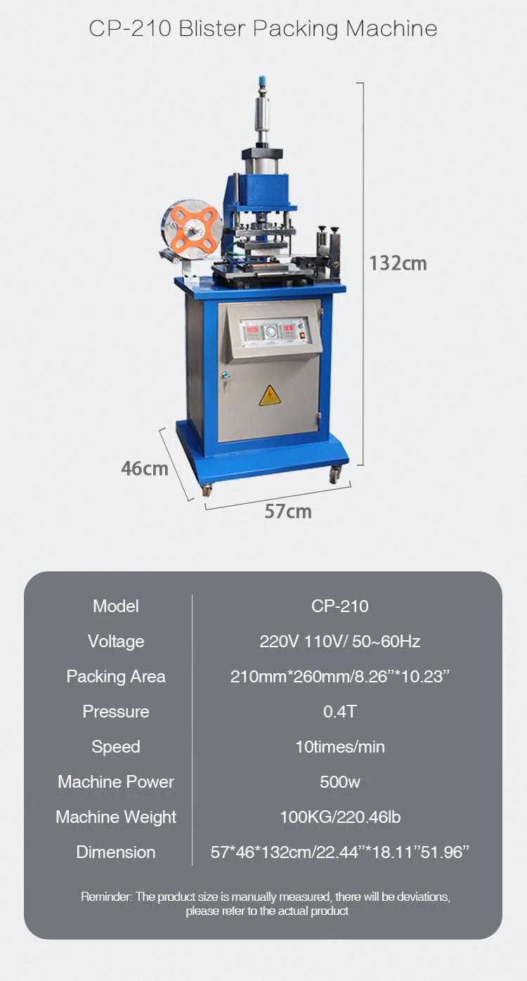 CP-210:1. Pneumatic control heating plate moves up and down 2. Automatically convey aluminum foil film 3. Digital display time relay controls heating time 4. The heating plate can be quickly replaced 5. An external air compressor is required 6. Foot pedal switch control