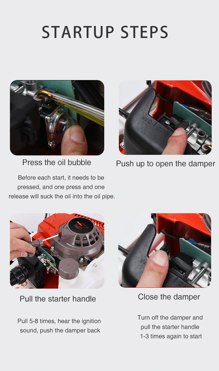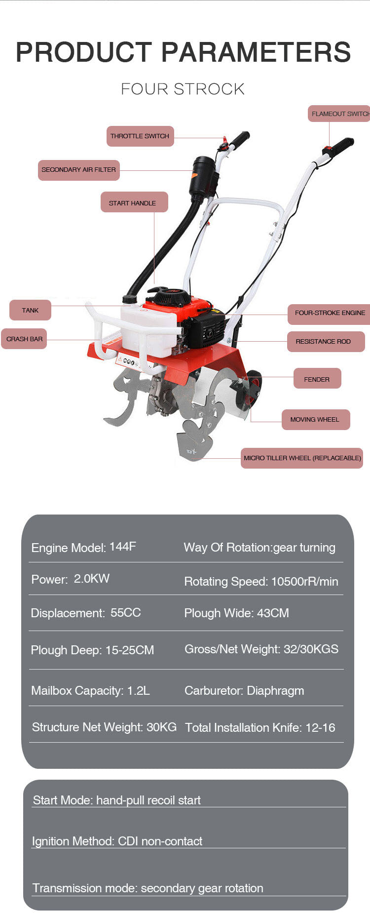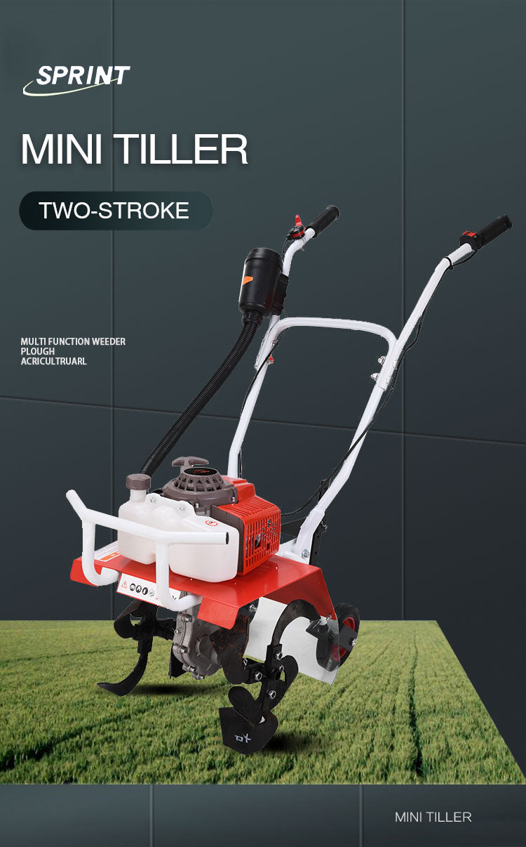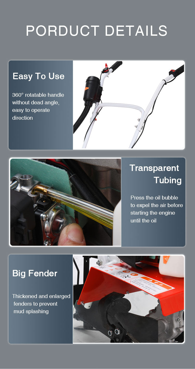 The mini tiller have multi-function suitable for various work heads, Stable performance and fuel saving, Three-dimensional circulation heat dissipation, high temperature resistance without flameout