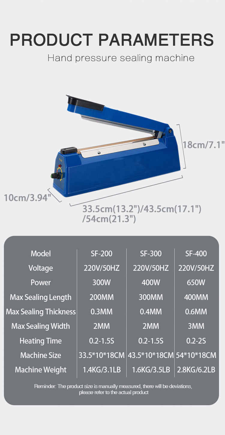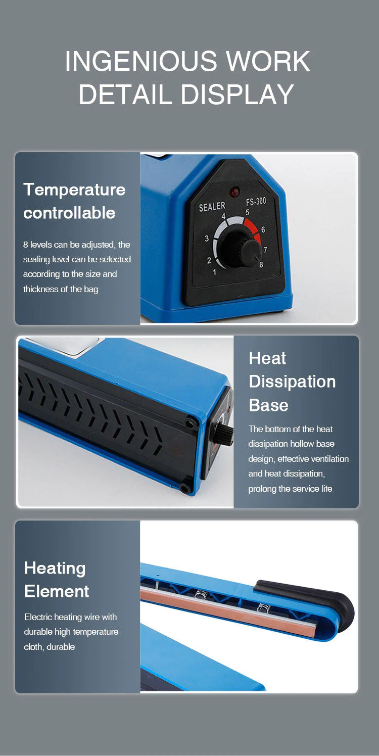 Hand impulse sealer machine is simple operation, connect the power to the work, suitable for various plastic film bags, composite film bags and aluminum-plastic film bag sealing.Heat seal band using nickel-chromium alloy, corrosion-resistant, easy to distort, outsourcing cloth, cushion high.