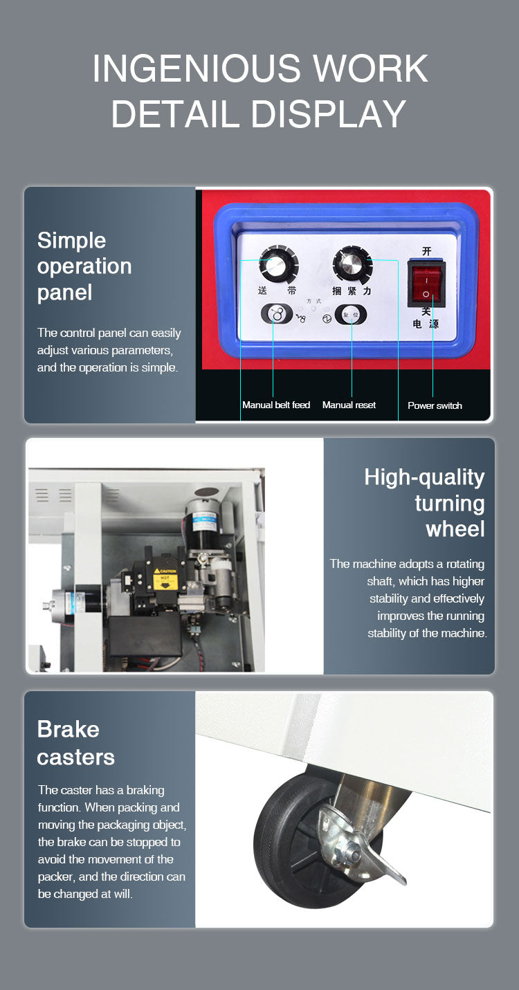 3.The caster has a braking function. When packing and moving the packaging object, the brake can be stopped to avoid the movement of the packer, and the direction can be changed at will.