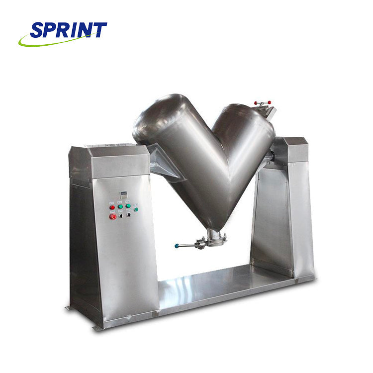 V Type powder Blender is composed of two cylinders welded together in a V shape, and the shape of the container is asymmetric with respect to the axis. Due to the rotating movement, the powder and granular bodies are continuously alternated, divided and merged in the inclined cylinder. The material is randomly transferred from one area to another, and at the same time, there is a slippage between the powder and granular particles, and the space is superimposed multiple times. V Type powder Blender are continuously distributed on the newly generated surface, so that the shearing and diffusion movement are repeated to achieve mixing.