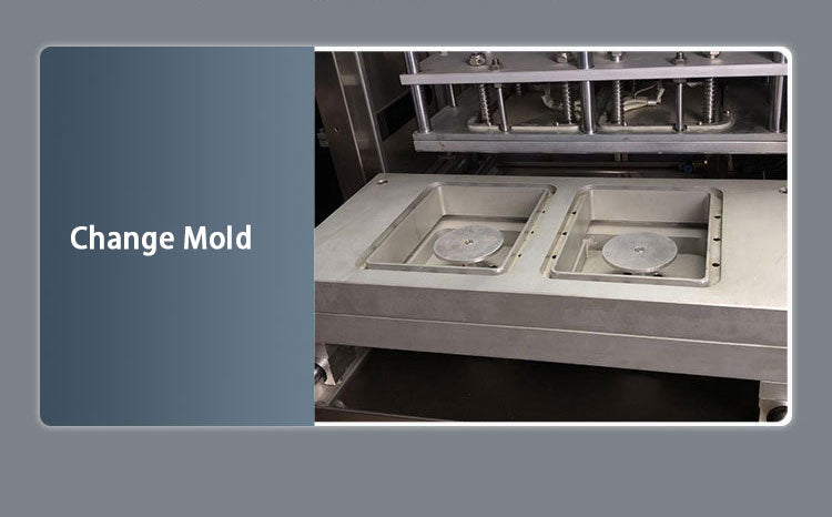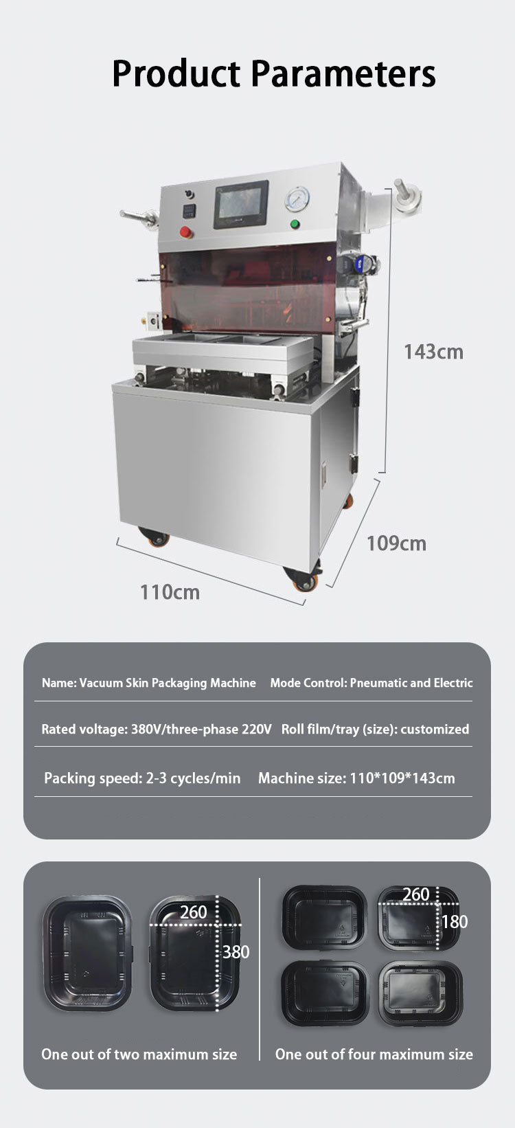 This vacuum skin packaging machine used for cooked food, cold fresh meat, seafood, fast food, etc. The equipment adopts PLC programmable control system, working parameter setting and control are accurate and stable, and the working status can be seen at a glance.