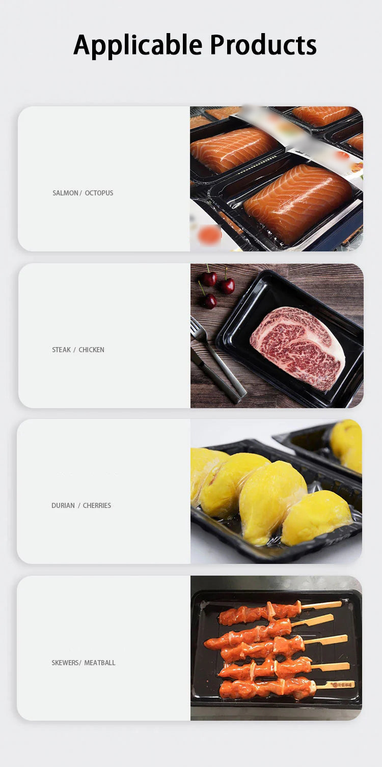 Vacuum skin packaging machine is widely used in supermarket distribution food such as fresh meat, cooked meat products, fish, poultry, shellfish, fruits, vegetables, etc.