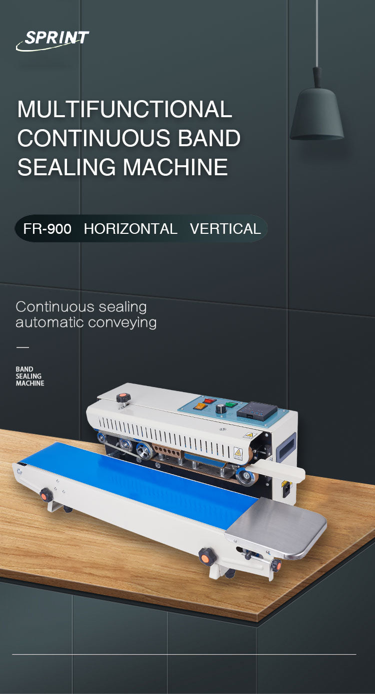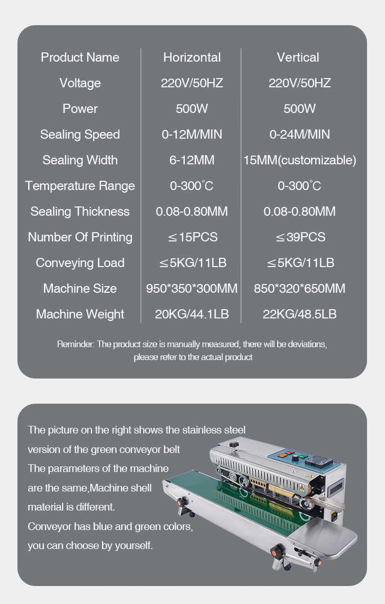 The Band sealer machine can be made horizontally and vertically .This sealing machine has two materials, one is spray paint and the other is stainless steel. Continuous sealing ,automatic conveying. Conveyor has blue and green colors, you can choose by yourself. Continuous film sealing machines finish continuous carrying, sealing and printing in one operation.The machine can be equiped with stripe wheel and flattening wheel, You can also replace the type to what you need. Different effects have different combinations.
