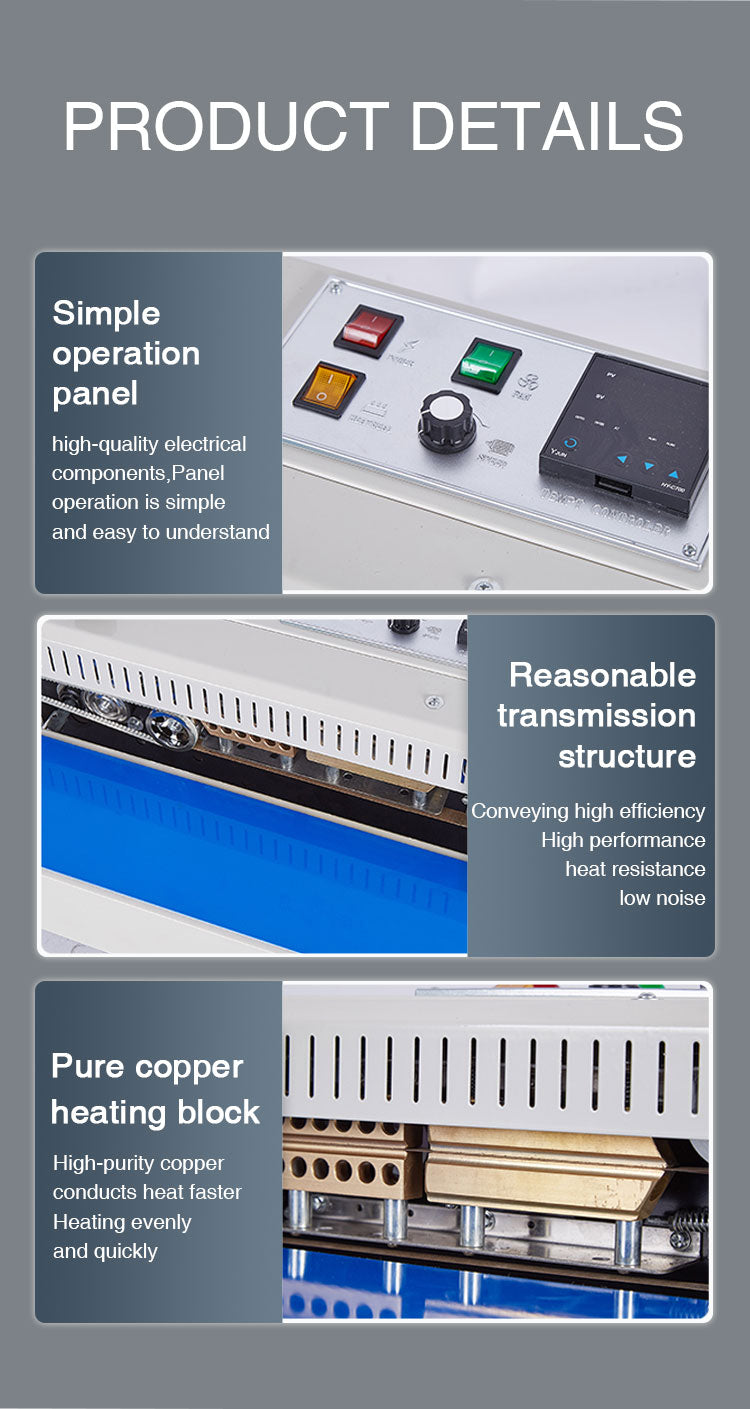 1.The sealing speed and the conveyor speed can be adjustable, with Chinese language button, double anti leakage, so that you operate more safely.